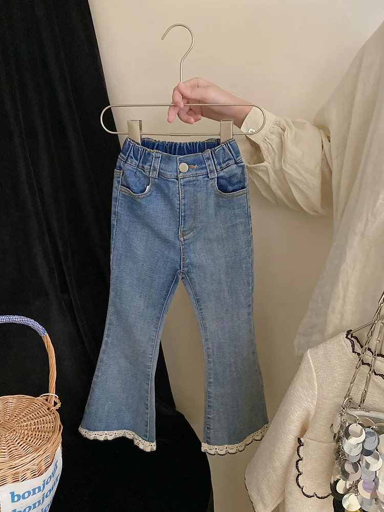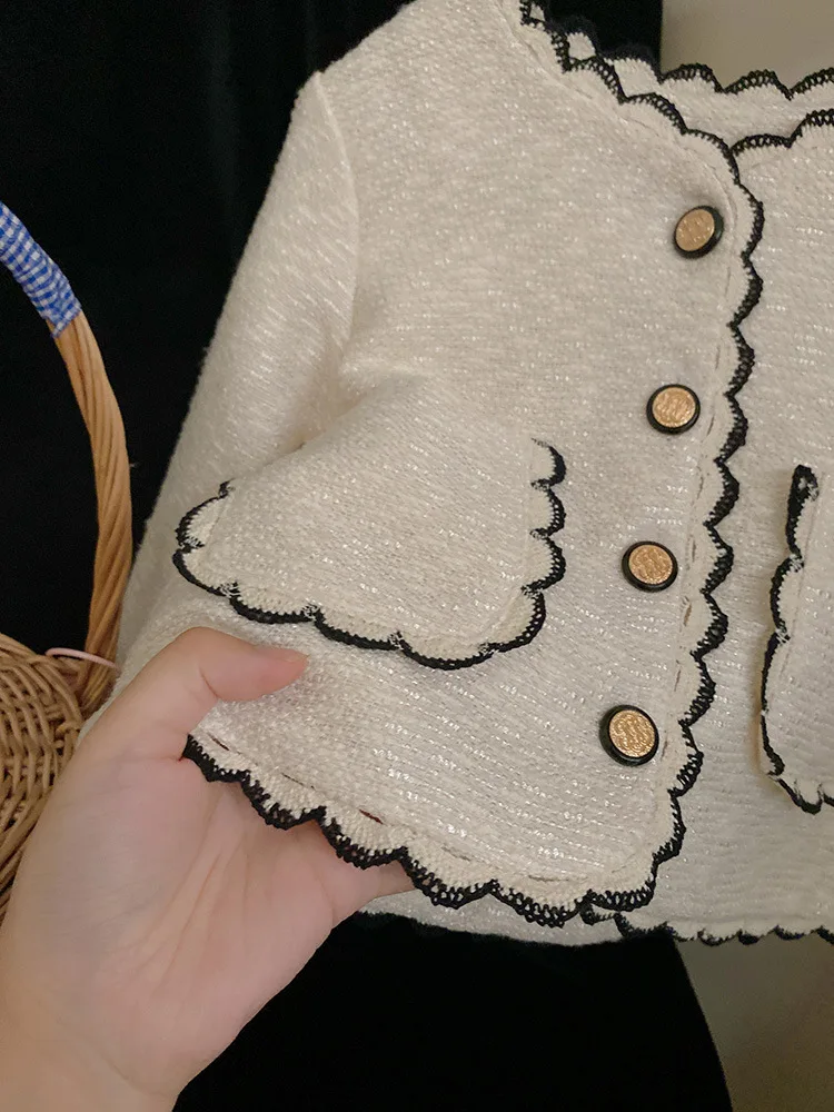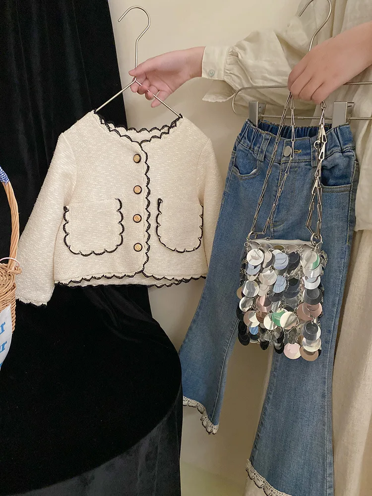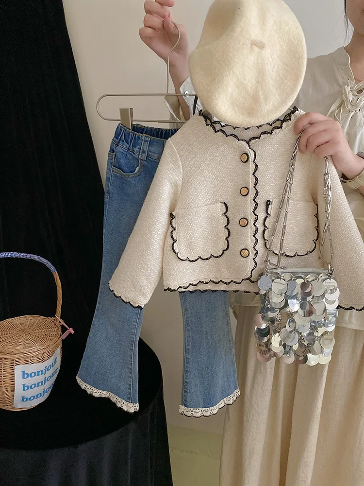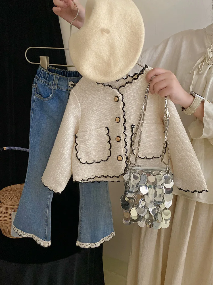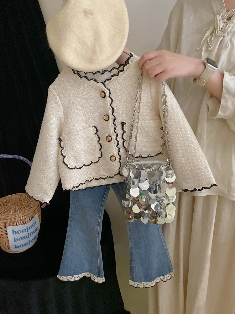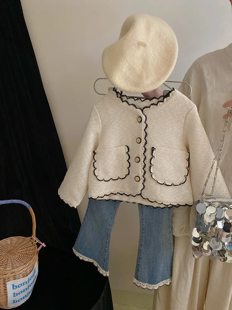 Coats Korean Childrens Clothing Autumn Season New Girls Open Stitch Lace Flower